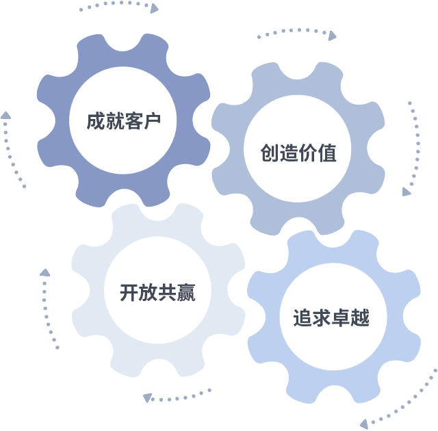 成就客户是一切决策的出发点,,创造价值是衡量所有工作的标准,,,,追求卓越是我们做事做人的态度,,开放共赢是我们的格局也是最终的结果。。。价值观的齿轮环环相扣,,,推动着组织里的每个人不断向前。。。