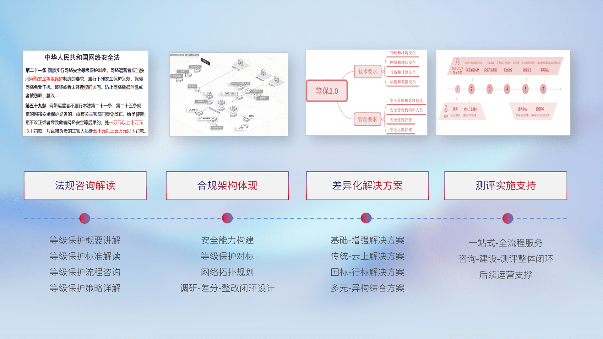 通过专业的法律咨询解读、、、、合规架构体现、、、、差异化解决方案、、测试实施支持等服务,,为客户量身打造等保合规体系。。。。